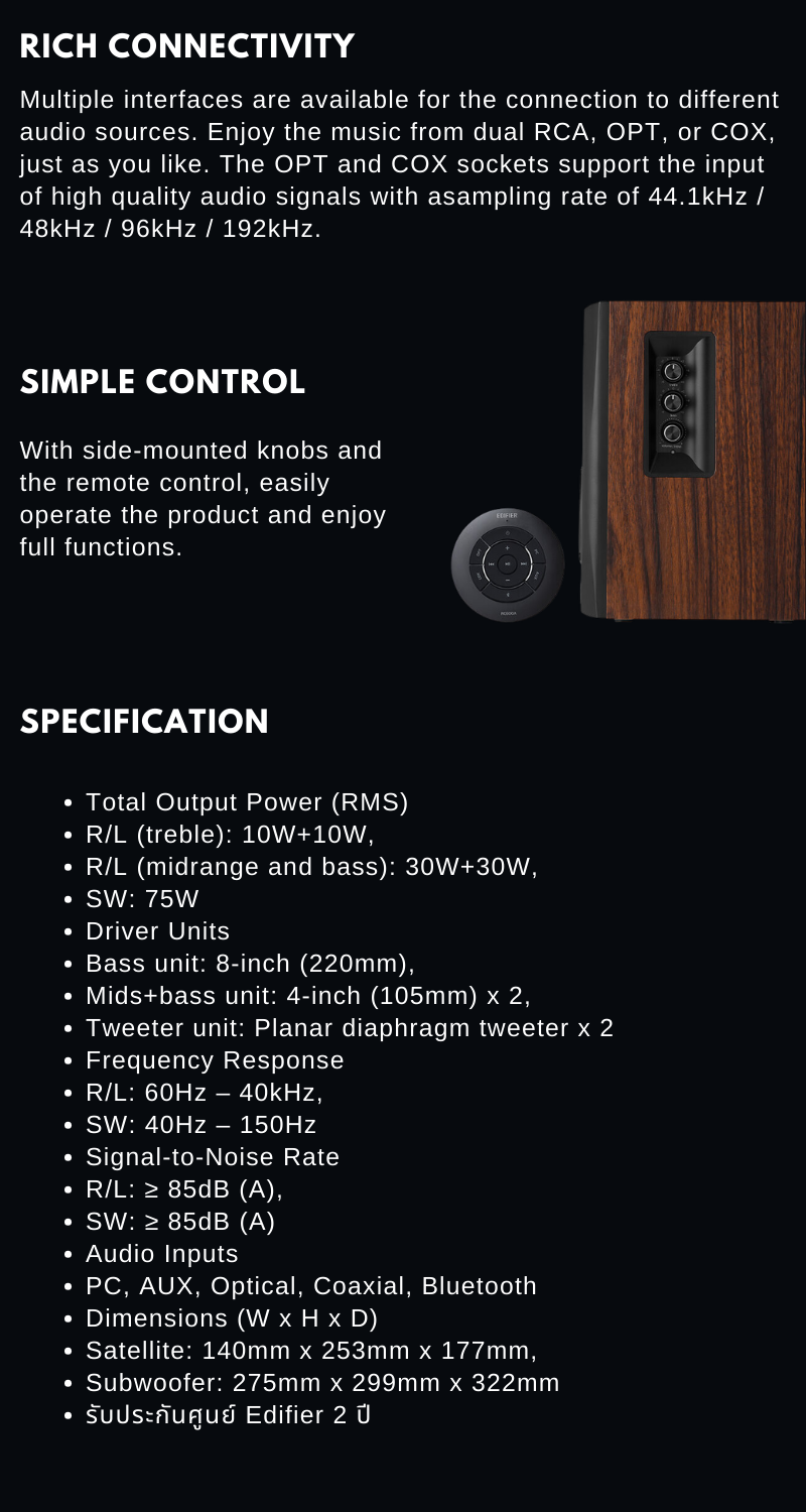-ครบเครื่องทั้งเรื่องเสียงและฟังก์ชั่นความบันเทิงได้ครบทุกการใช้งาน มีช่อง ( Dual RCA inputs ) สามารถต่อสัญญานแบบดิจิตอล Optical / Coaxia