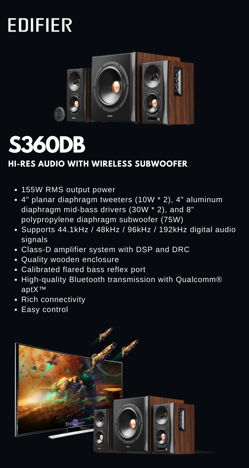 -S360DB ชุดลำโพงมัลติมีเดีย 2.1 แชนแนล กำลังขับรวม เพาเวอร์แอมป์ขนาด 155วัตต์ RMS ภาคขยายใช้ระบบ Bi-amp และสายลำโพงแบบ Bi-Wire