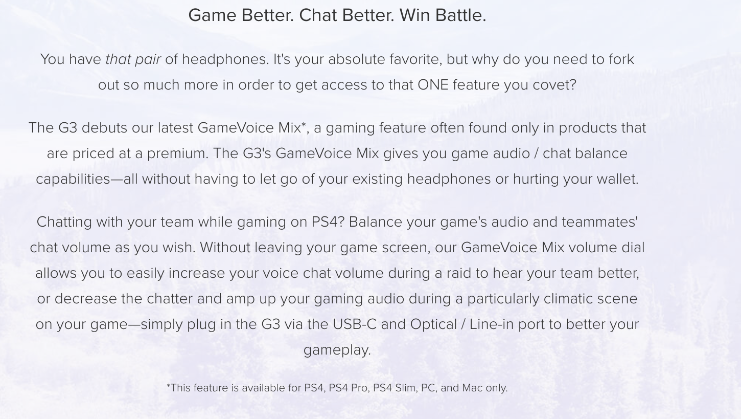 -IMPROVED COMMS WITH FRIENDS VIA GAMEVOICE MIX FEATURE - Get the optimum gaming and voice chat audio levels with our GameVoice Mix! Chatting with your team while gaming? Instead of fiddling for the perfect levels through Windows, just use our GameVoice Mix volume dial to easily increase your voice chat volume during a raid to hear your team better, or decrease the chatter and amp up your gaming audio during a particularly climatic scene on your game — all without having to leave your game screen