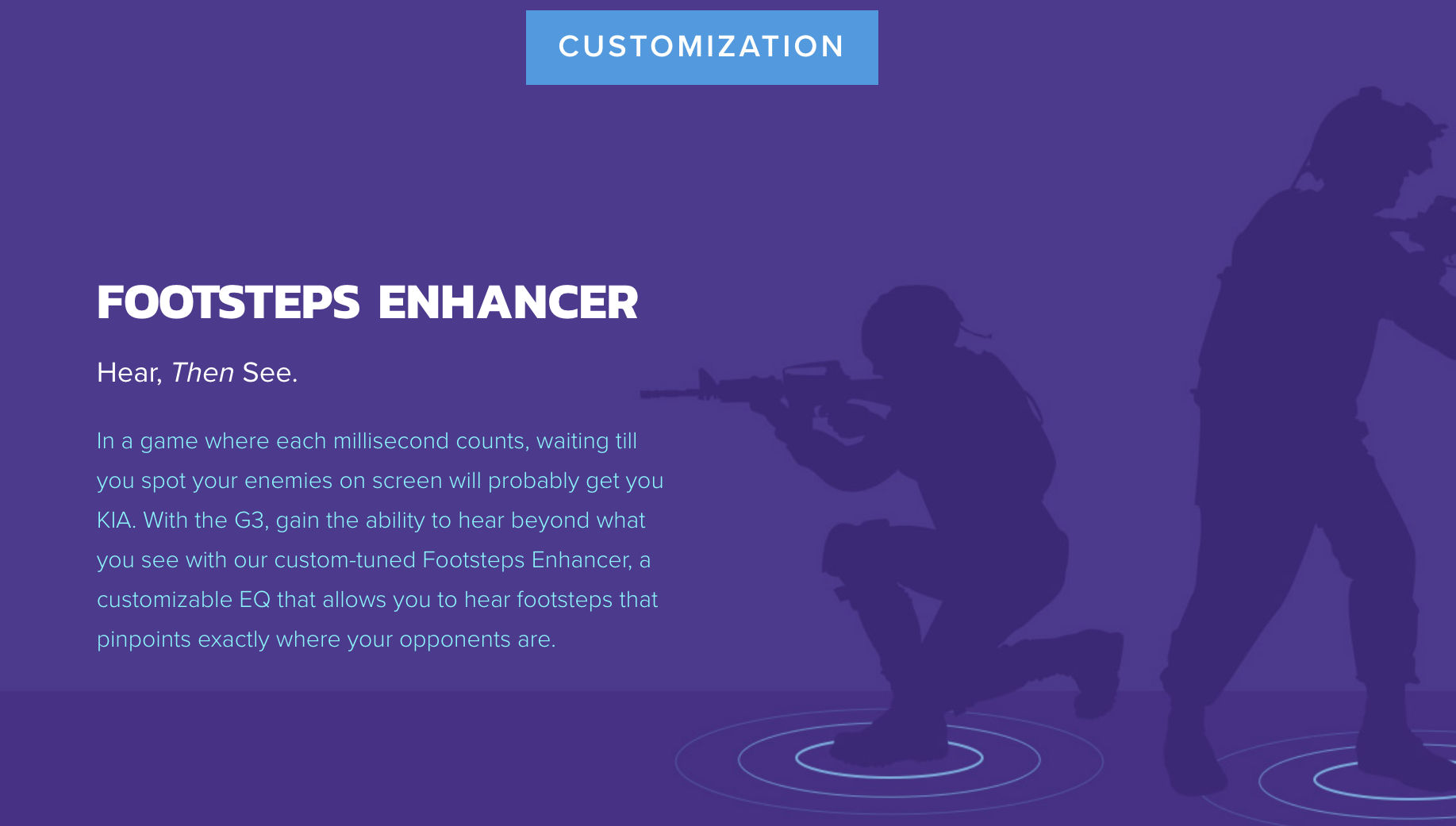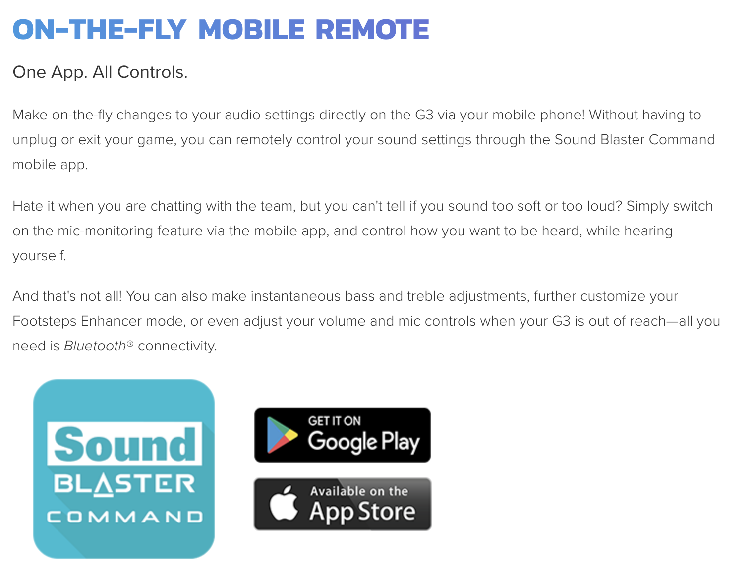 -MIC-MONITORING AND ON-THE-FLY AUDIO ADJUSTMENTS VIA MOBILE APP - Get your enemies before they get to you with our Footsteps Enhancer EQ mode. Customize it further via our Sound Blaster Command app (for iOS and Android) to manage audio settings on-the-fly without exiting your game or unplugging your G3! By pairing the G3 to your mobile phone, easily adjust volume and mic controls, or access the mic-monitoring feature so you can control how loud you want to be heard, while hearing yourself