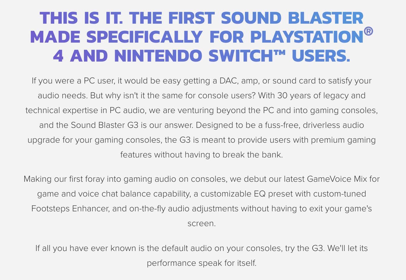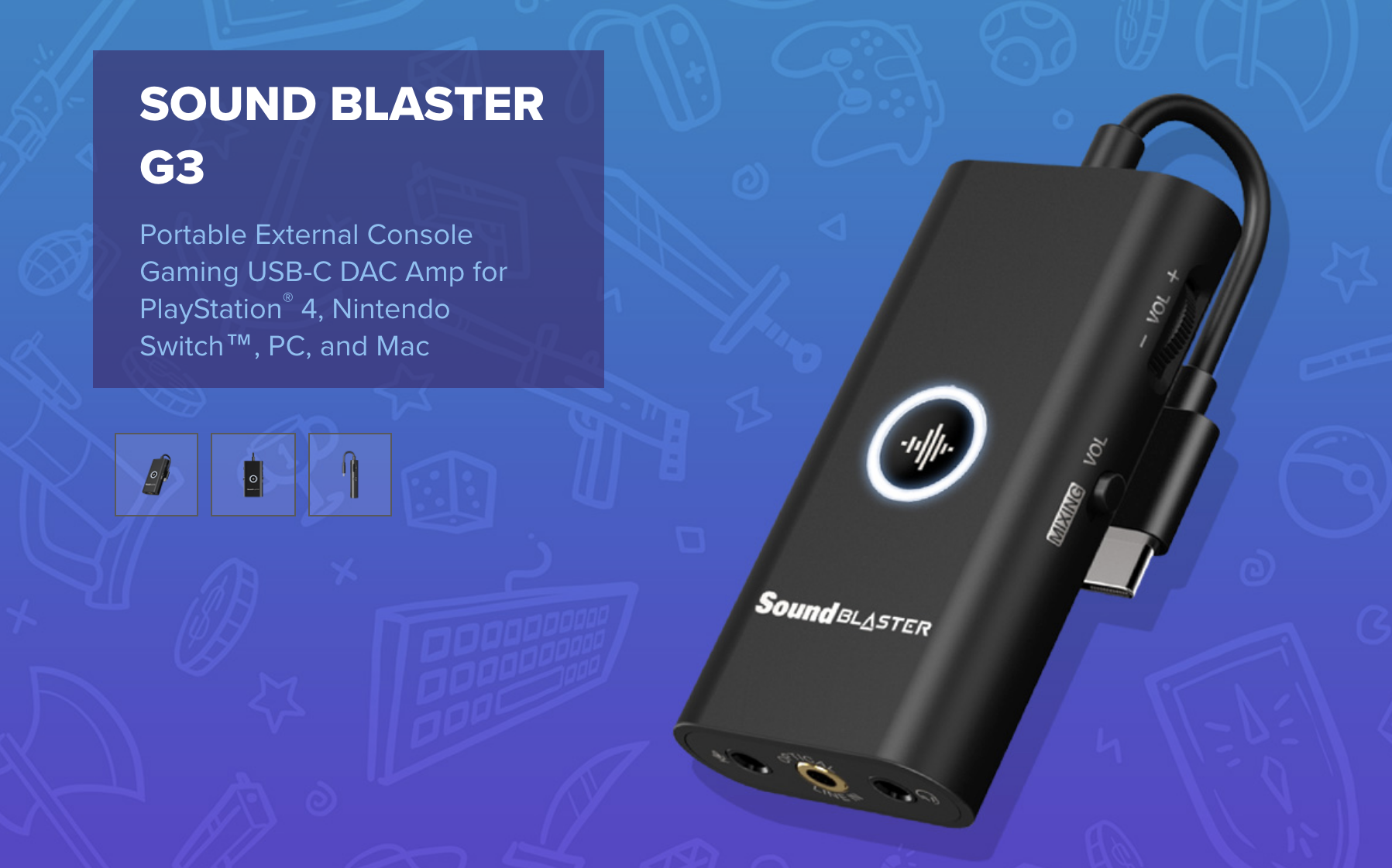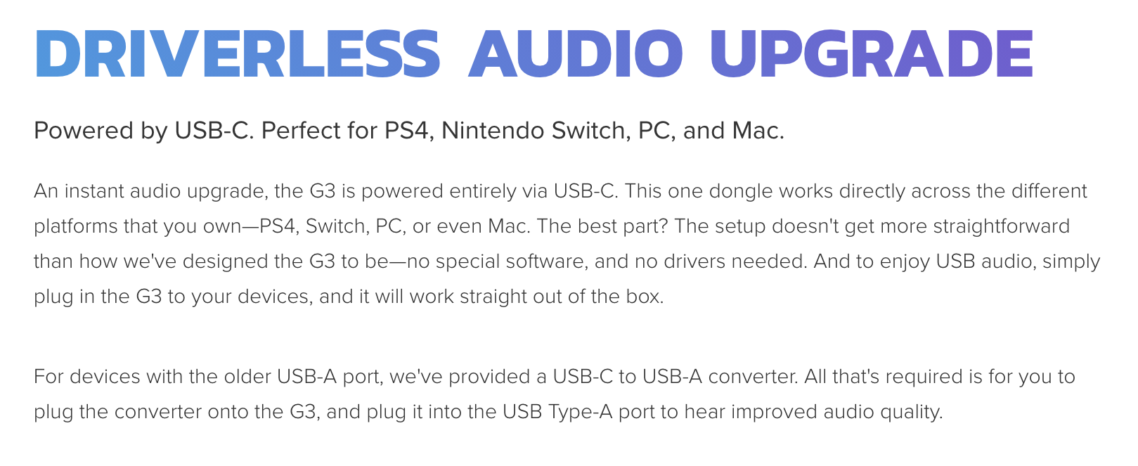 -DRIVERLESS USB-C PLUG-AND-PLAY WITH USB AUDIO - Powered entirely via USB-C in a plug-and-play driverless format, the Sound Blaster G3 is a hassle-free instant audio upgrade for your gaming consoles (PS4 and Switch), and well as PC and Mac computers. Featured with USB audio, simply connect the G3 to your gaming console via USB-C (or the provided USB-C-to-USB-A converter), and it will work straight out of the box. There’s absolutely no fiddling with extra settings or installation to get started