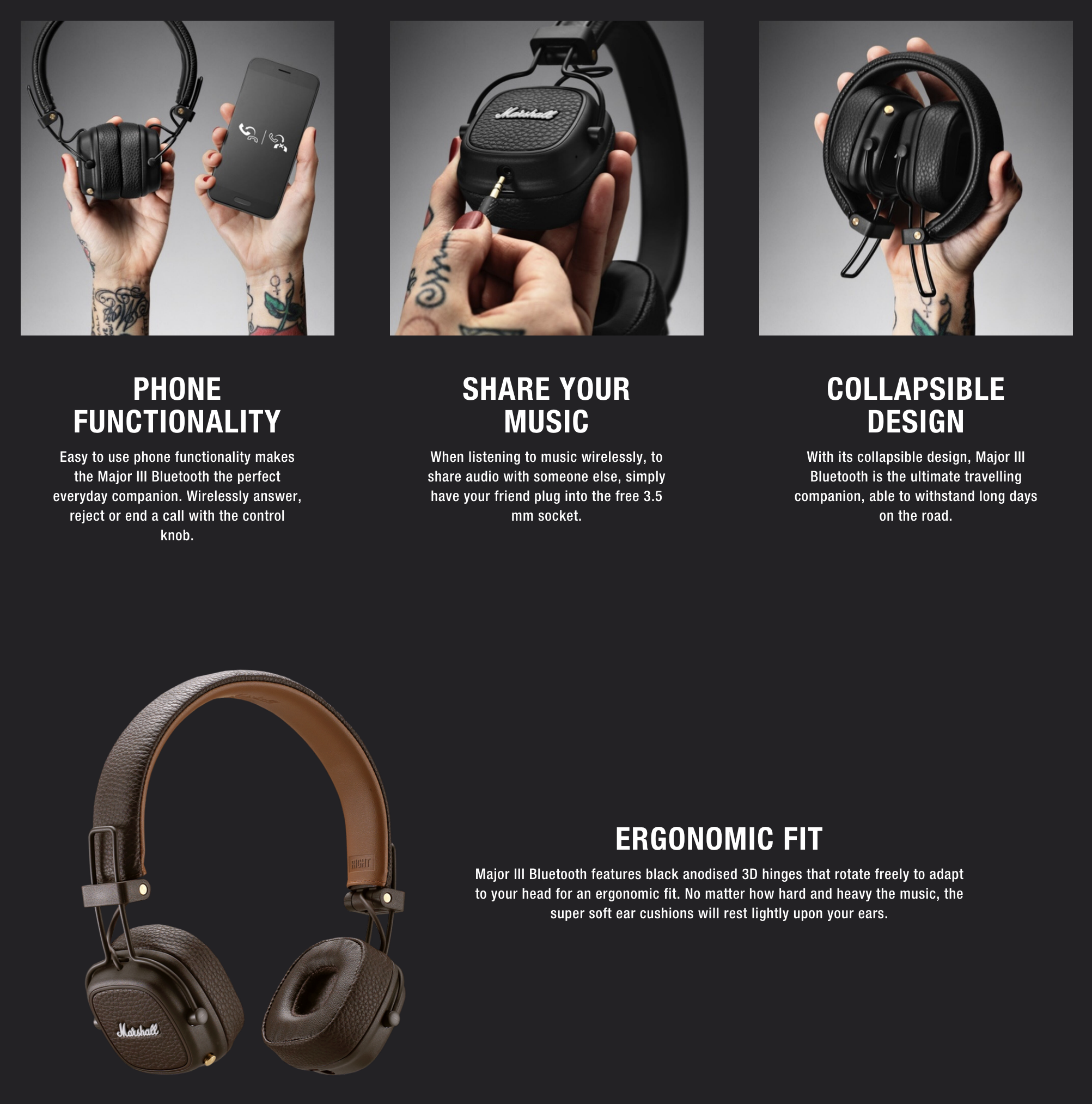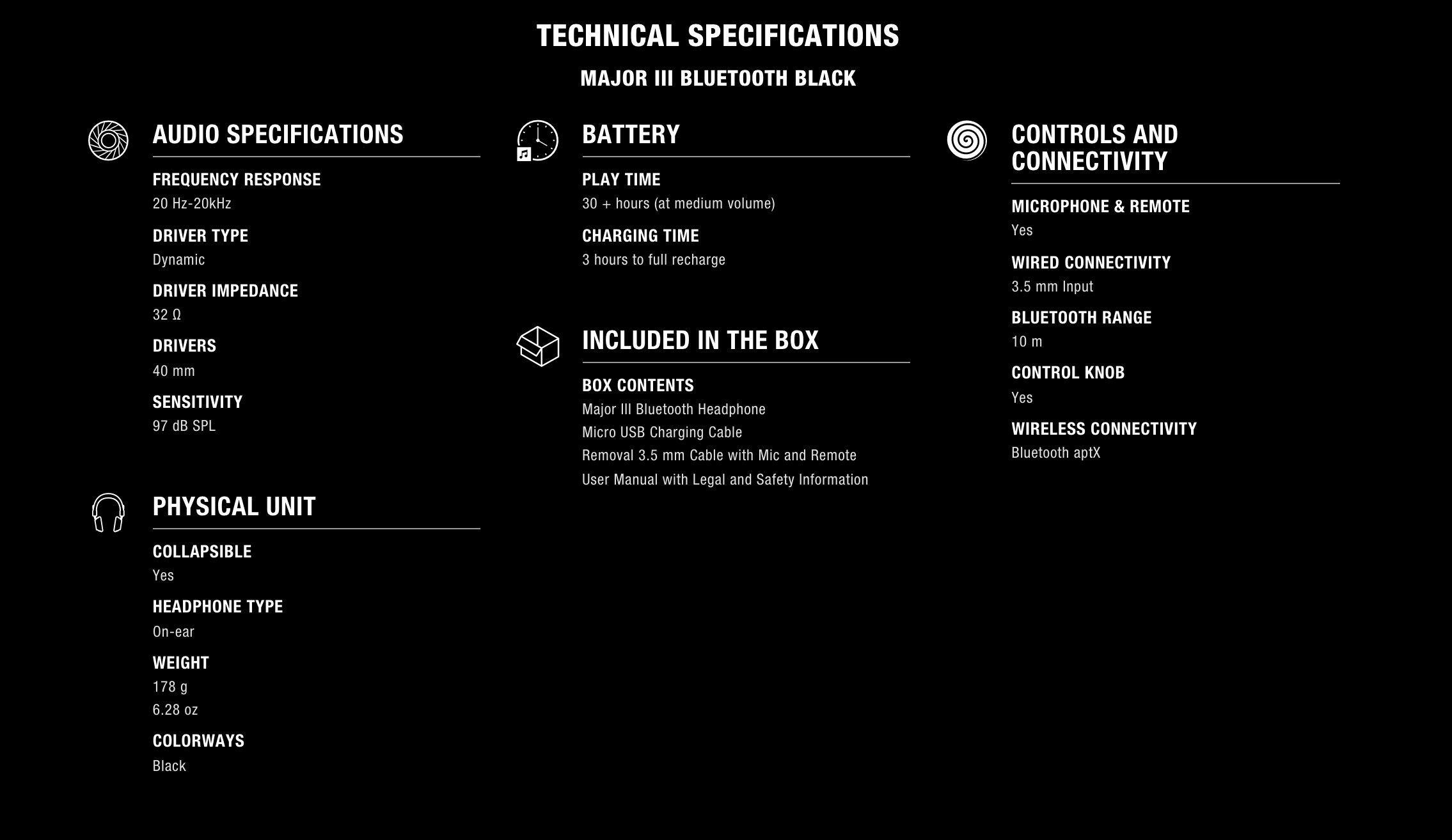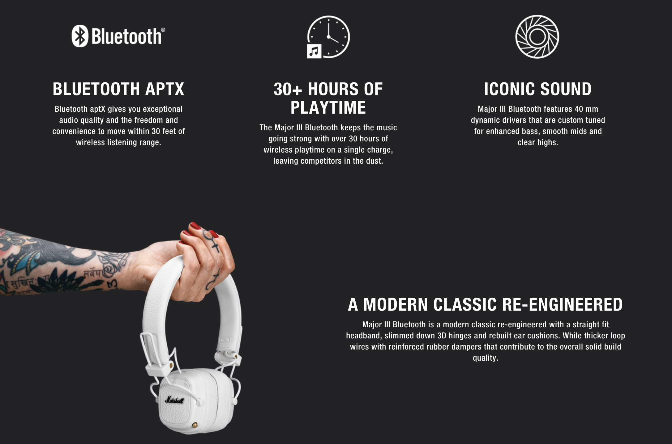 ![]() ![]() ![]() ![]() ![]() ![]() MAJOR III BLUETOOTH Major III Bluetooth is the next chapter in the revolutionary history of Marshall. Major III Bluetooth offers you the freedom and convenience of wireless Bluetooth aptX technology and 30+ hours of playtime on a single charge. 30+ HOURS OF WIRELESS PLAYTIME This modern go-to classic has been re-engineered for a cleaner more refined design, while the silhouette stays true to its original form. |