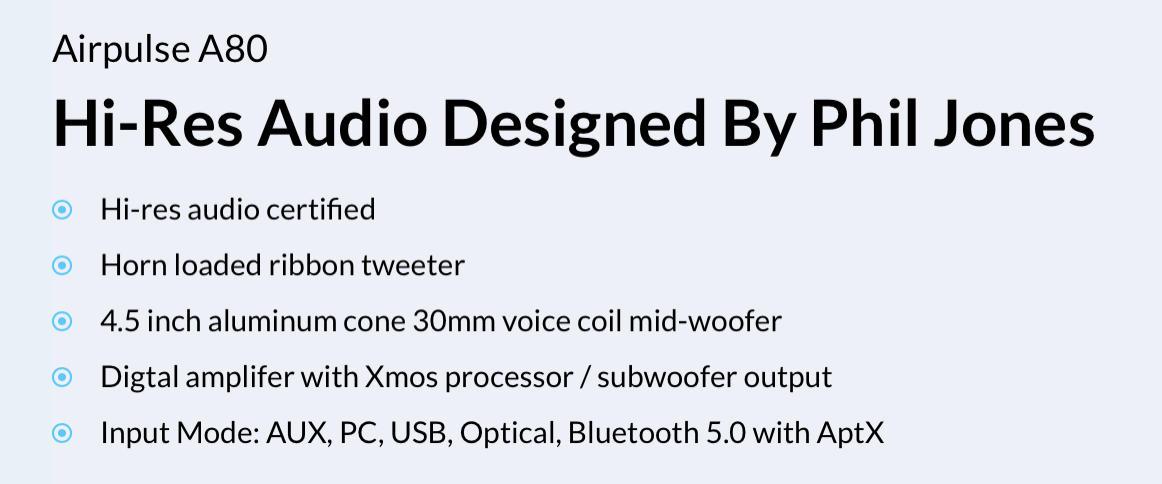 -ลำโพงรุ่น AIRPULSE A80 นั้นมาพร้อม Xmos Processor(แอมป์แดค) TAS5754 Class-D จาก Texas Instrument รองรับ768 KHz (Output) 2x 384 KHz (S/PDIF) Traditional Class-D amplifier กันเลยละครับ