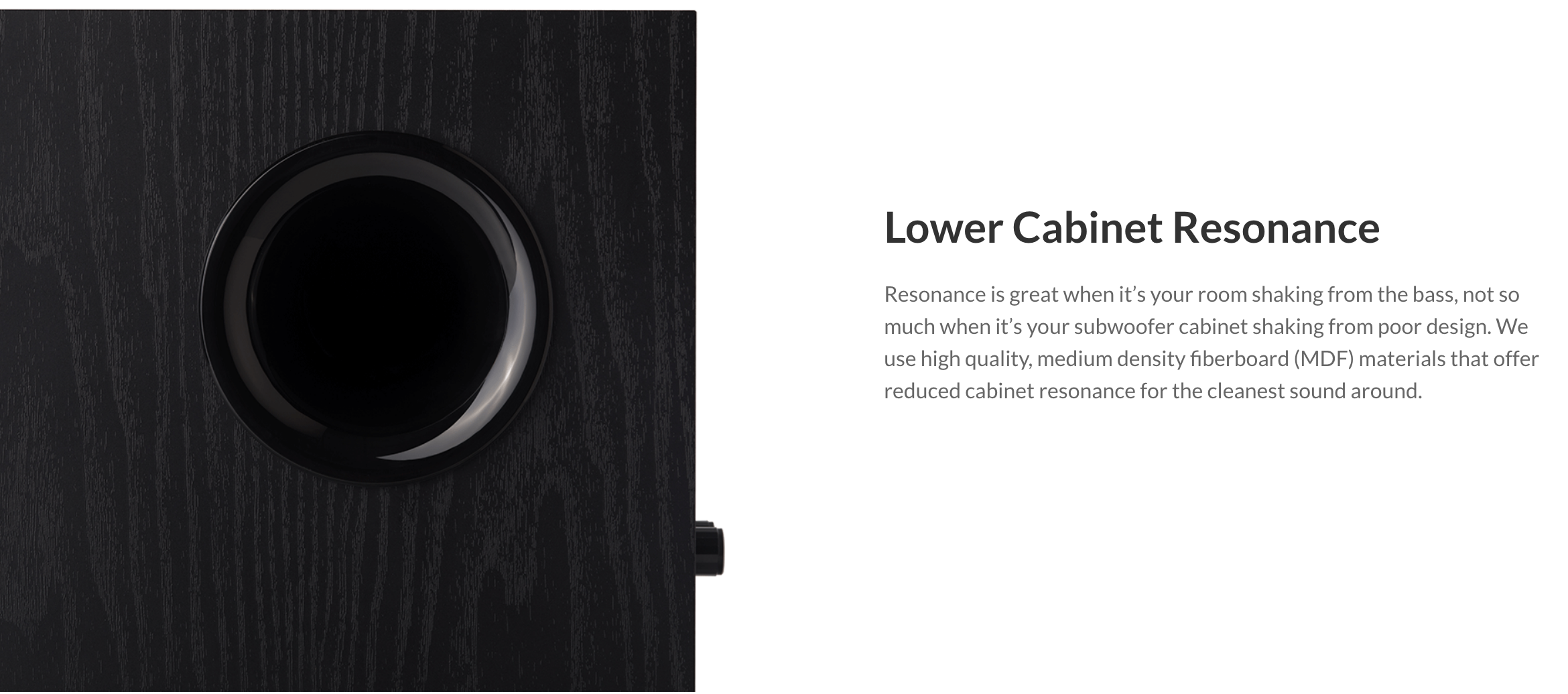 Resonance is great when it’s your room shaking from the bass, not so much when it’s your subwoofer cabinet shaking from poor design. We use high quality, medium density fiberboard (MDF) materials that offer reduced cabinet resonance for the cleanest sound around.