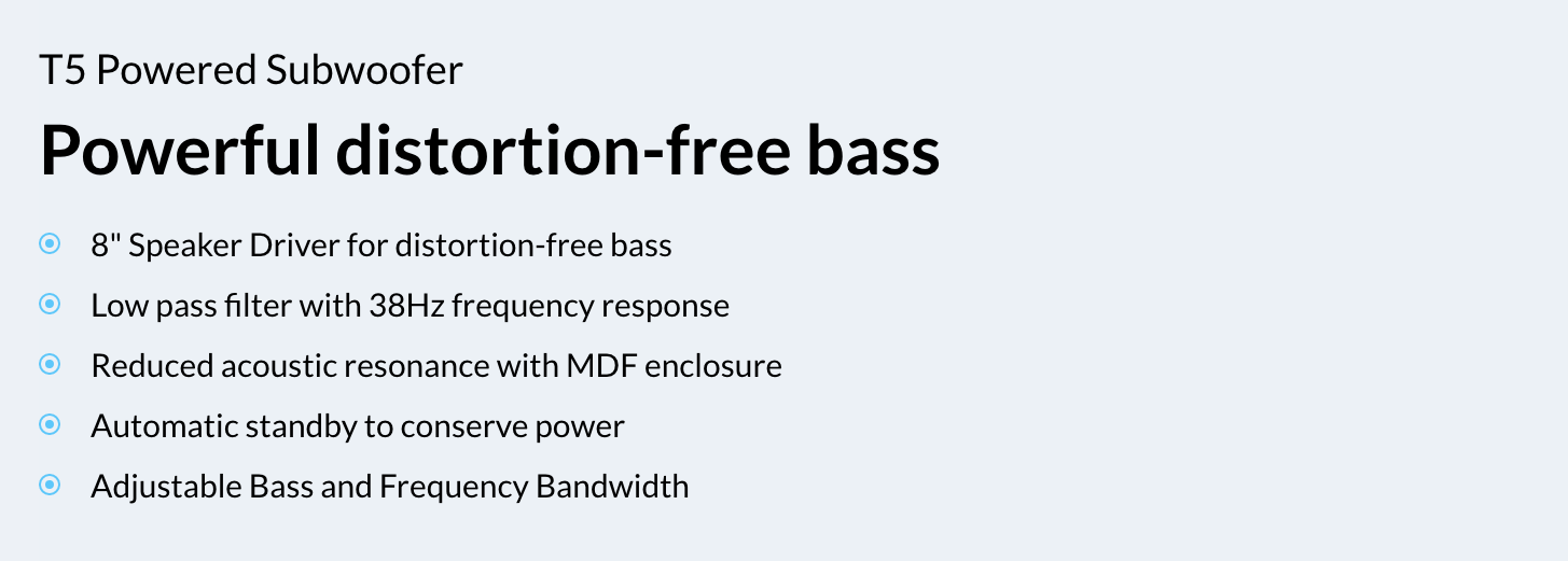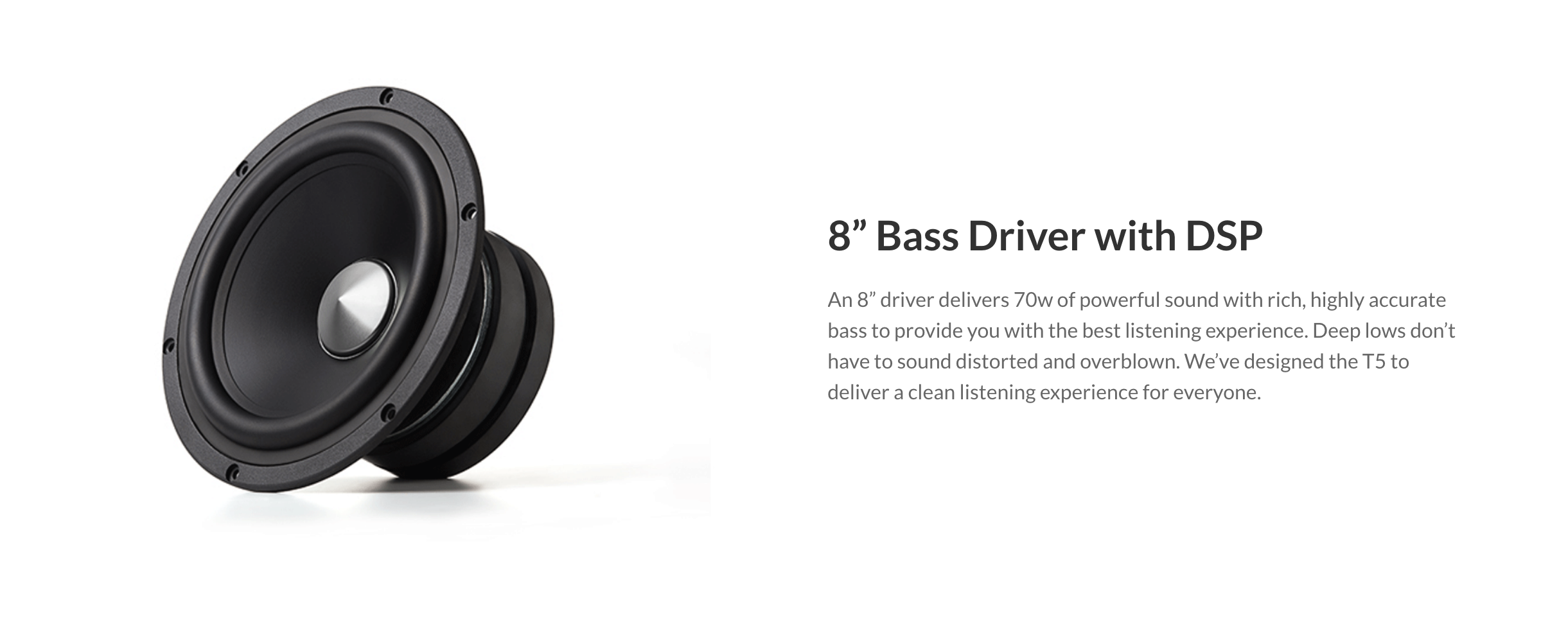 An 8” driver delivers 70w of powerful sound with rich, highly accurate bass to provide you with the best listening experience. Deep lows don’t have to sound distorted and overblown. We’ve designed the T5 to deliver a clean listening experience for everyone.