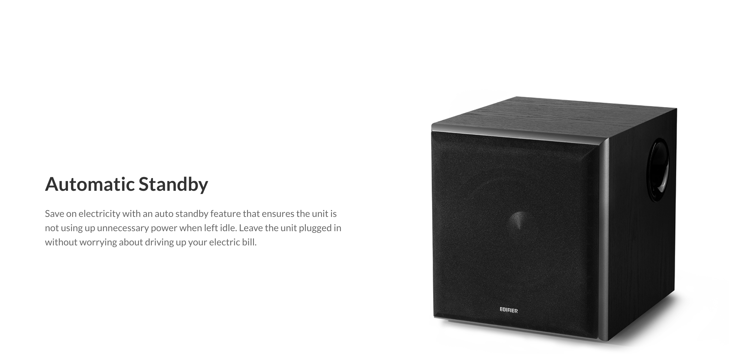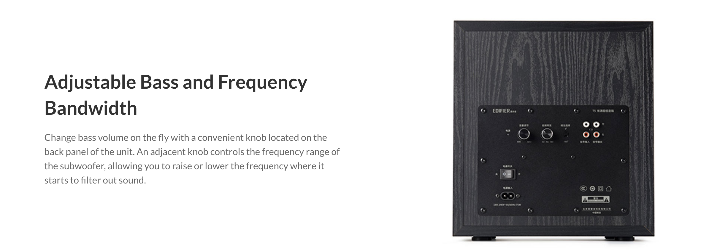 Edifier T5 subwoofer สามารถถ่ายทอดคุณภาพเสียงเบสได้ตามสไตล์แบบตู้เบส Active ตัววูฟเฟอร์ยิงด้านหน้าเข้าหาตัวผู้ฟัง ให้เสียงย่านต่ำที่แผ่กว้าง โอบล้อม เป็นลูกไม่บวมเบลอ ลงลึก เก็บตัวได้รวดเร็ว