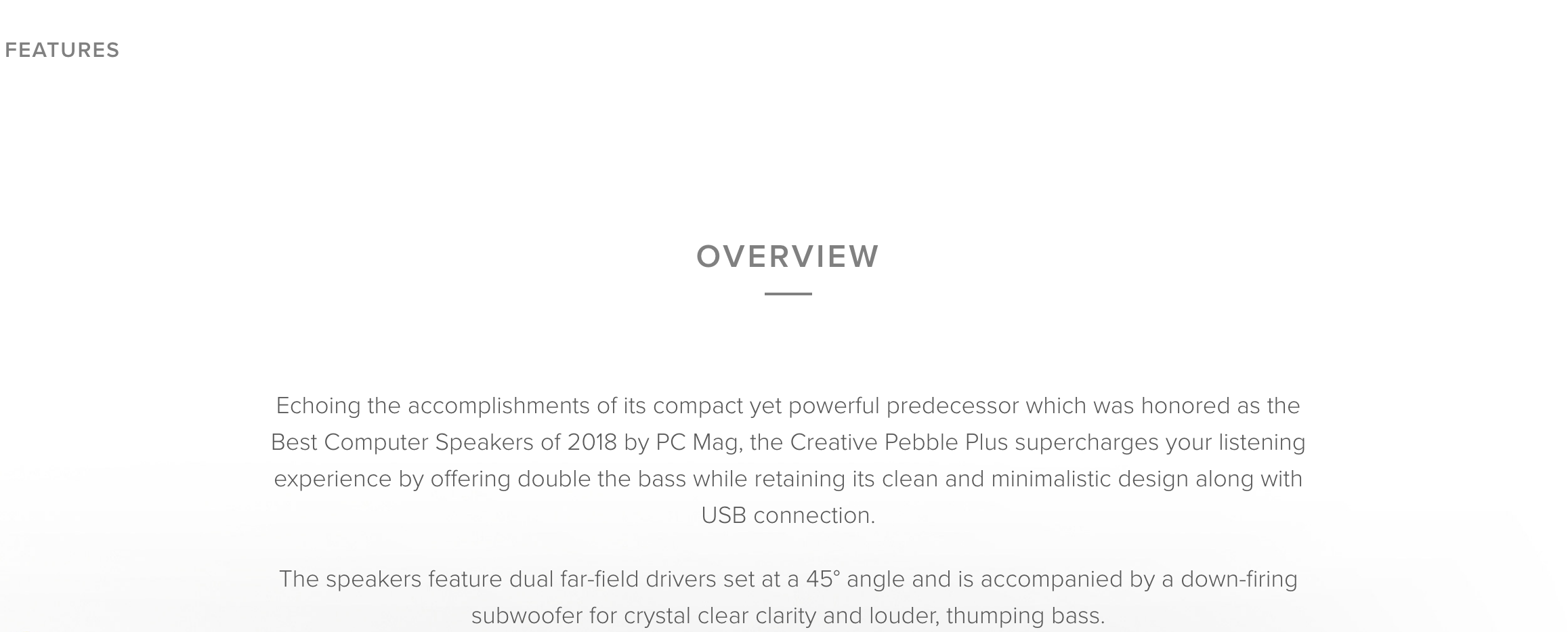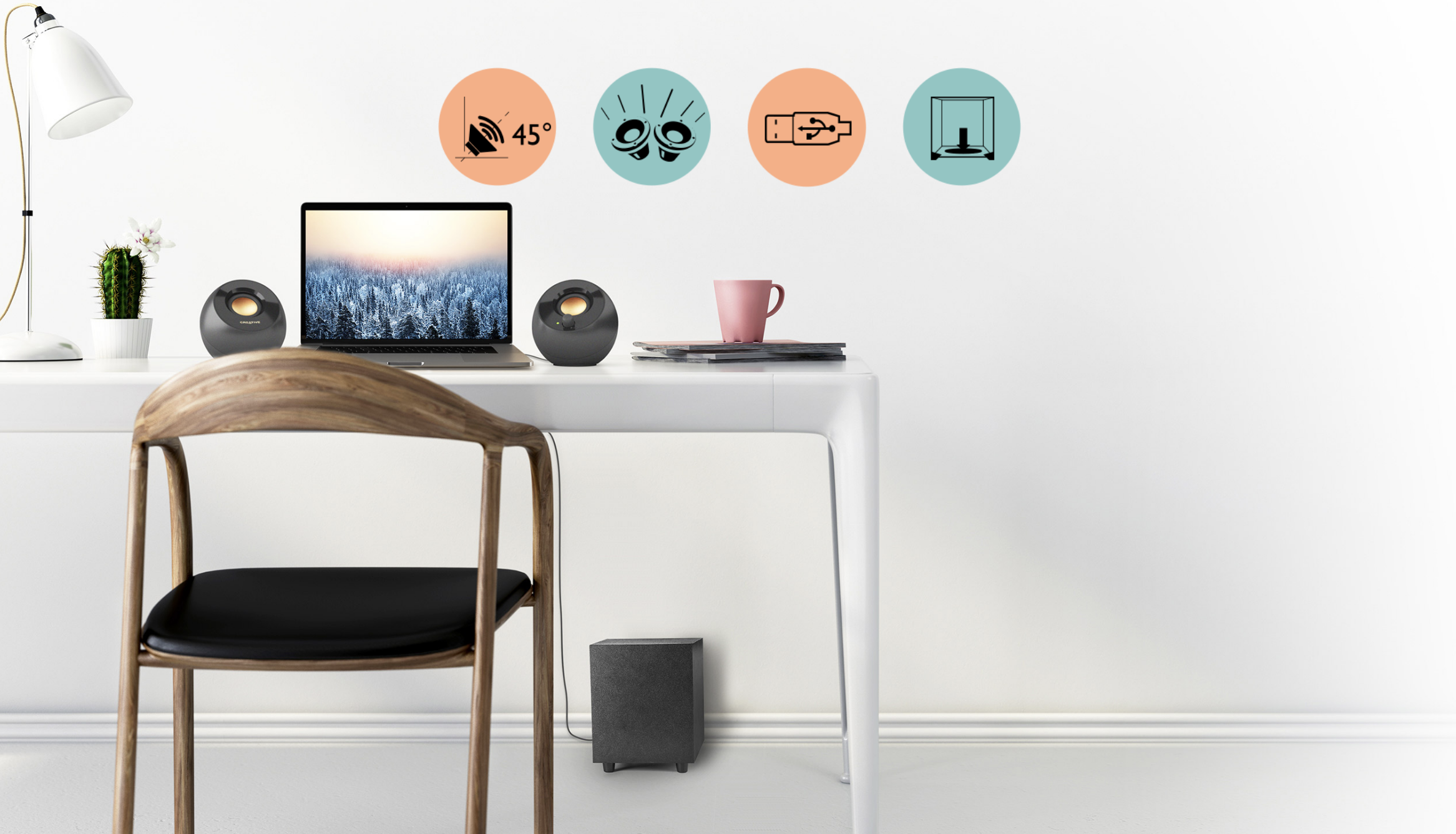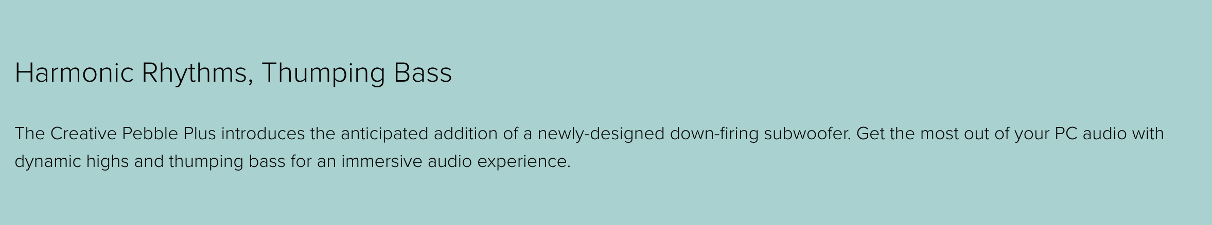 -ลำโพงคอมพิวเตอร์ดีที่สุดของปี 2018 โดย PC MAG Creative Pebble Plus ยกระดับการประสบการณ์การฟังของคุณโดยให้เสียงเบสเป็นสองเท่า ในขณะที่ยังคงการออกแบบดีไซน์ เรียบง่าย พร้อมการเชื่อมต่อด้วย พอร์ต USB