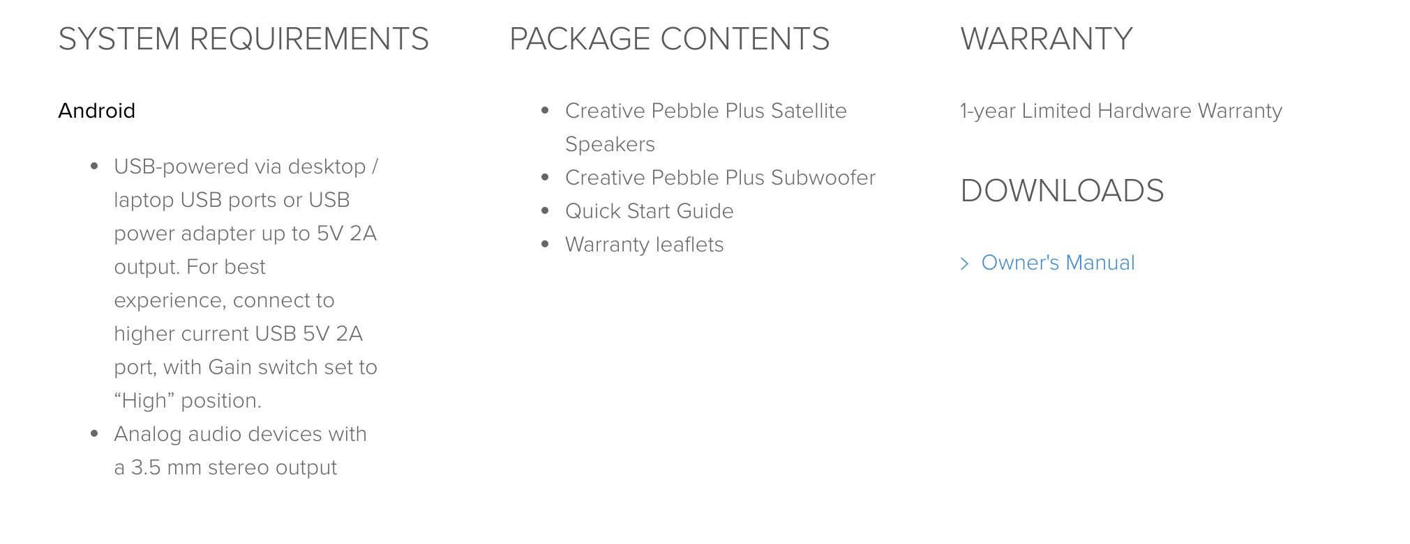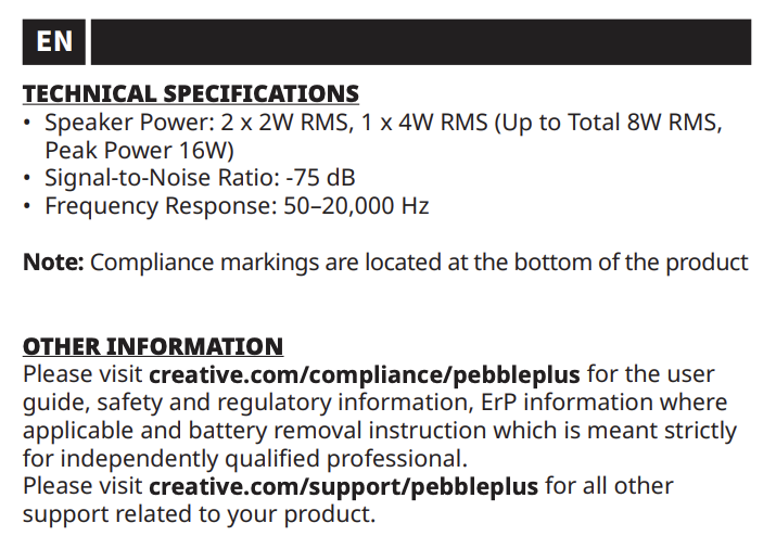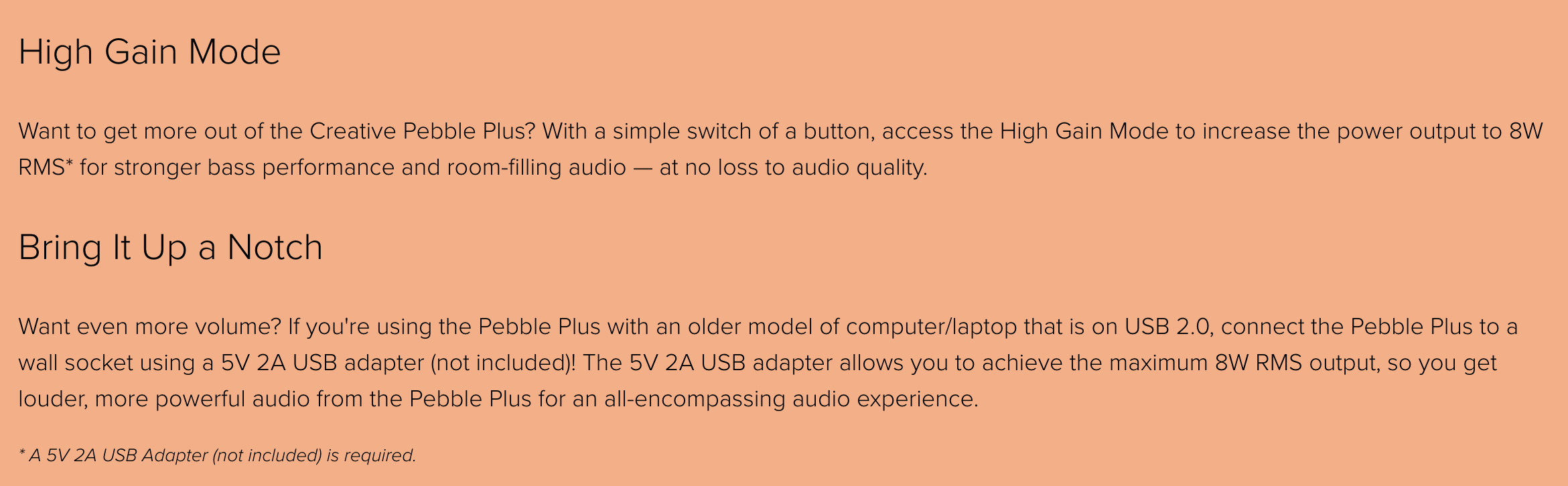 -หากเราต้องการเพิ่มพลังเสียงให้มากกว่า 8 วัตต์ นอกจากการใช้งานผ่านช่อง USB เชื่อมต่อกับคอมพิวเตอร์แล้ว เรายังสามารถใช้ อะแดปเตอร์ USB 5V 2A (ไม่รวมอยู่ในชุดกล่องอุปกรณ์) เสียบกับปลั๊กไฟบ้าน เพื่อให้คุณได้รับพลังเสียงที่ดังและทรงพลังมากขื้นอีกจาก Pebble Plus เพื่อประสบการเสียงที่ครอบคลุม