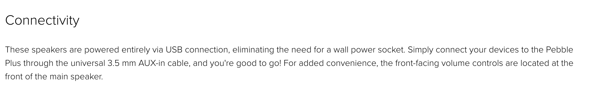 -การเชื่อมต่อ นอกการเชื่อมต่อด้วยพอร์ต USB เข้ากับคอมพิวเตอร์โดยไม่ต้องใช้พลังงานจากปลั๊กไฟบ้านแล้ว เพียงเชื่อมต่ออุปกรณ์กับ Pebble Plus ผ่านสาย AUX-in ขนาด 3.5mm ก็สะดวกในการรับฟังเพลงและสามารถคอนโทรลเสียงได้ด้านหน้าตัวลำโพงอีกด้วย
