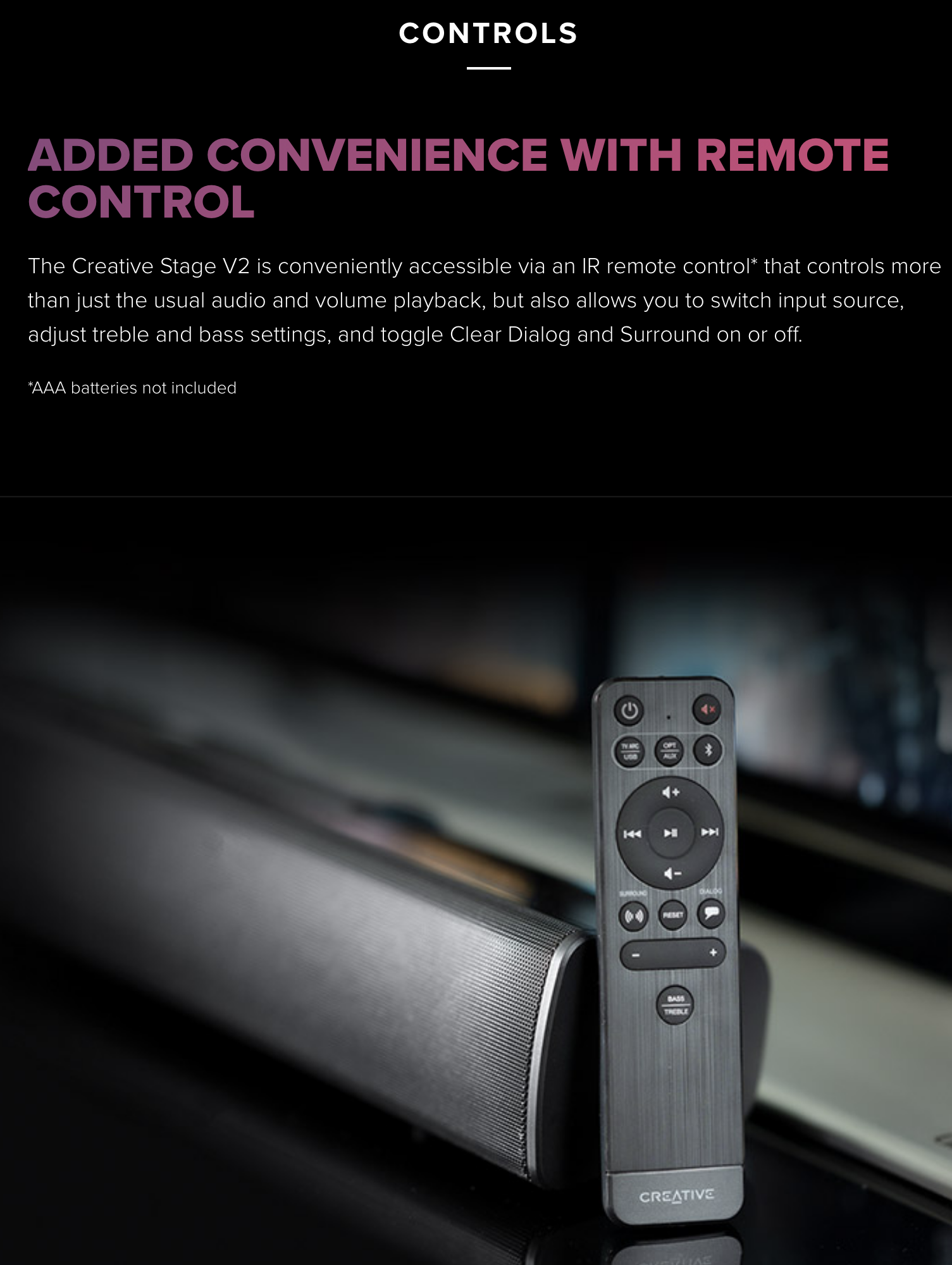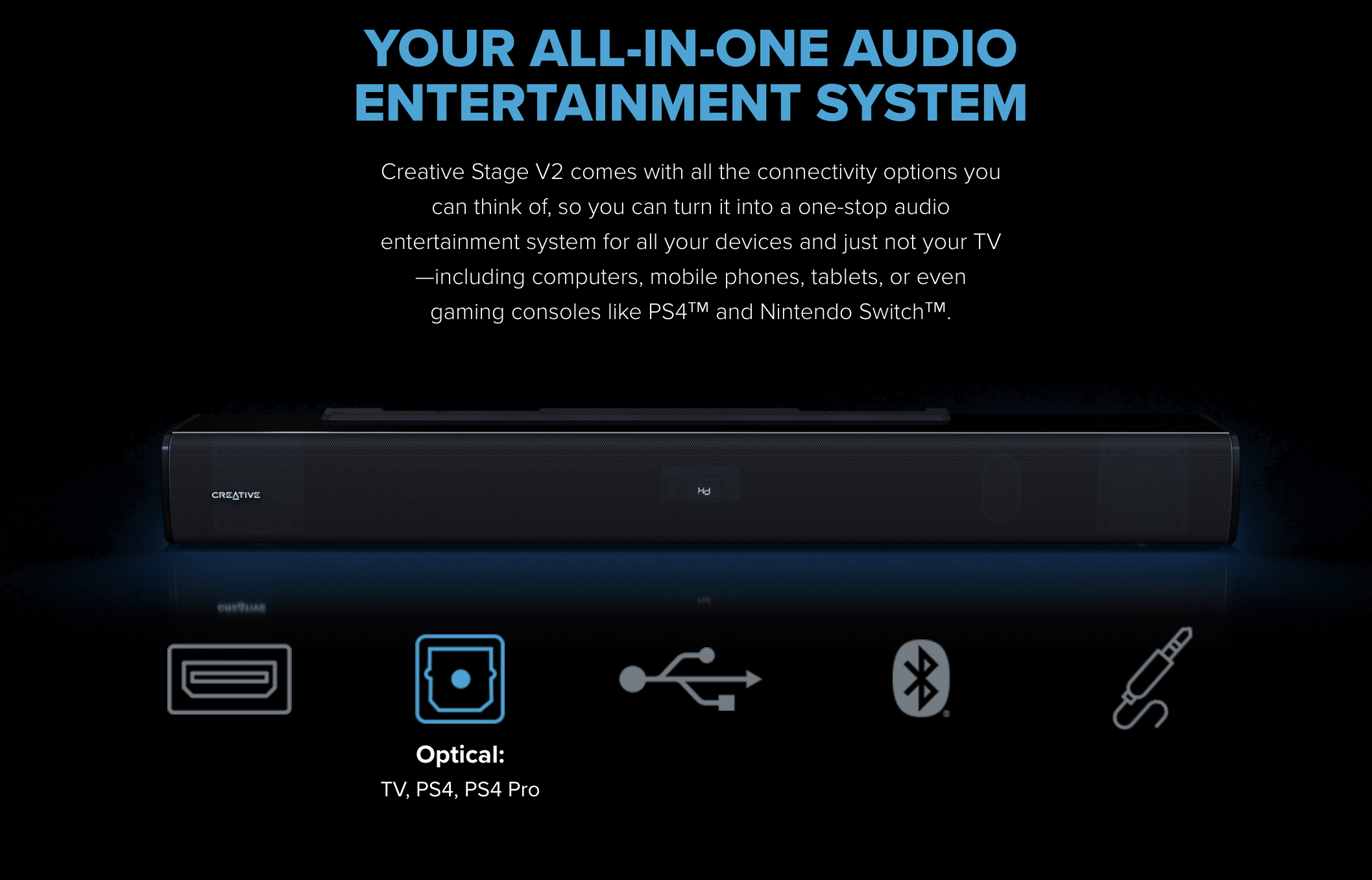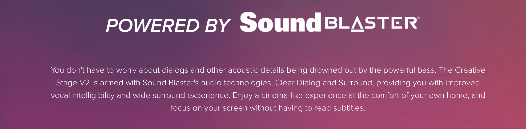 OVERVIEW The latest addition to our soundbar family, Creative Stage V2 now takes the stage as our latest all-in-one audio solution for your home. Debuting with Clear Dialog and Surround, audio features powered by our renowned Sound Blaster audio expertise, Creative Stage V2 is an easy upgrade for you to enjoy cinema experience at the comfort of your own home. Fill your living room with expansive rich audio and deep impactful bass with the soundbar and its dedicated subwoofer. With a wide range of connectivity options, the Creative Stage V2 is a one-stop audio entertainment system for all your devices. ![]() ![]() YOUR TV DESERVES TO SOUND BETTER Sure, your 4K TV looks magnificent, but they seldom have the sound to match. Upgrade your TV experience with the sound it deserves by adorning it with the Creative Stage V2. Immerse yourself in movies or games while Creative Stage V2 brings you exceptional sound quality with its custom-tuned mid-range drivers and deep thumping bass from the accompanying powerful long-throw subwoofer. ![]() ![]() SURROUND CLEAR DIALOG Complete your immersive movie experience with our Surround technology, powered by Sound Blaster to deliver a wider soundstage to your media! It is capable of identifying and enhancing the spatial information of incoming audio via Sound Blaster's audio filters, thereby optimizing the listening experience for both two-channel and multi-channel source content. The result is expanded soundstage and spatialized audio from any type of audio source, including Netflix, HBO, and Amazon Prime Video, providing you with a more realistic and comfortable listening experience akin to cinemas. It's great when your movie or game comes with rich and immersive audio, but it's a total downer if the dialog gets drowned out amongst the explosive sound effects and music. Clear Dialog extracts the vocals and spoken dialog through an algorithm, then intelligently enhances and amplifies them, allowing you to hear each syllable clearly, and without compromising on the other ambient effects. ![]() ![]() ![]() ![]() ![]() CONNECTIVITY  |