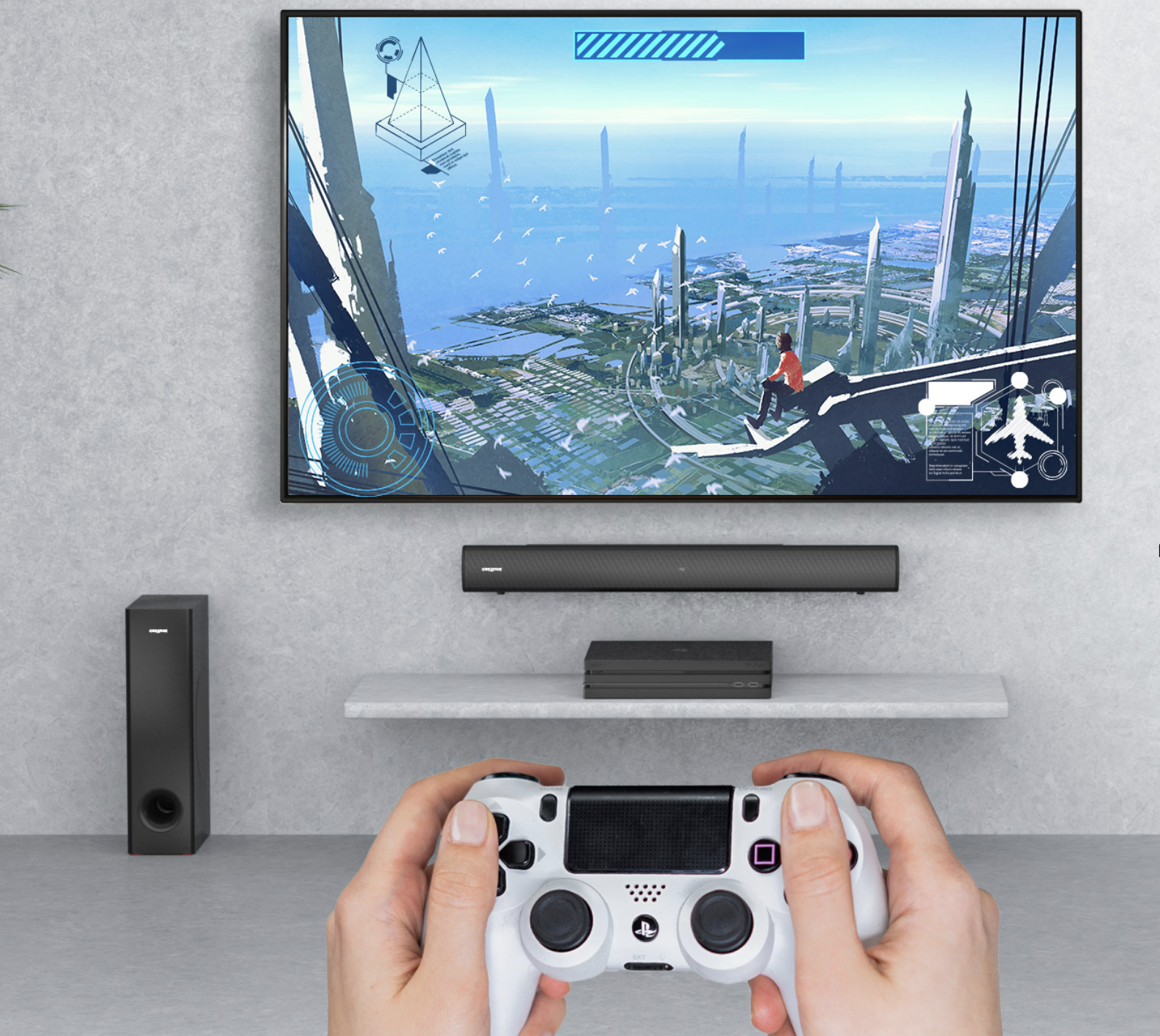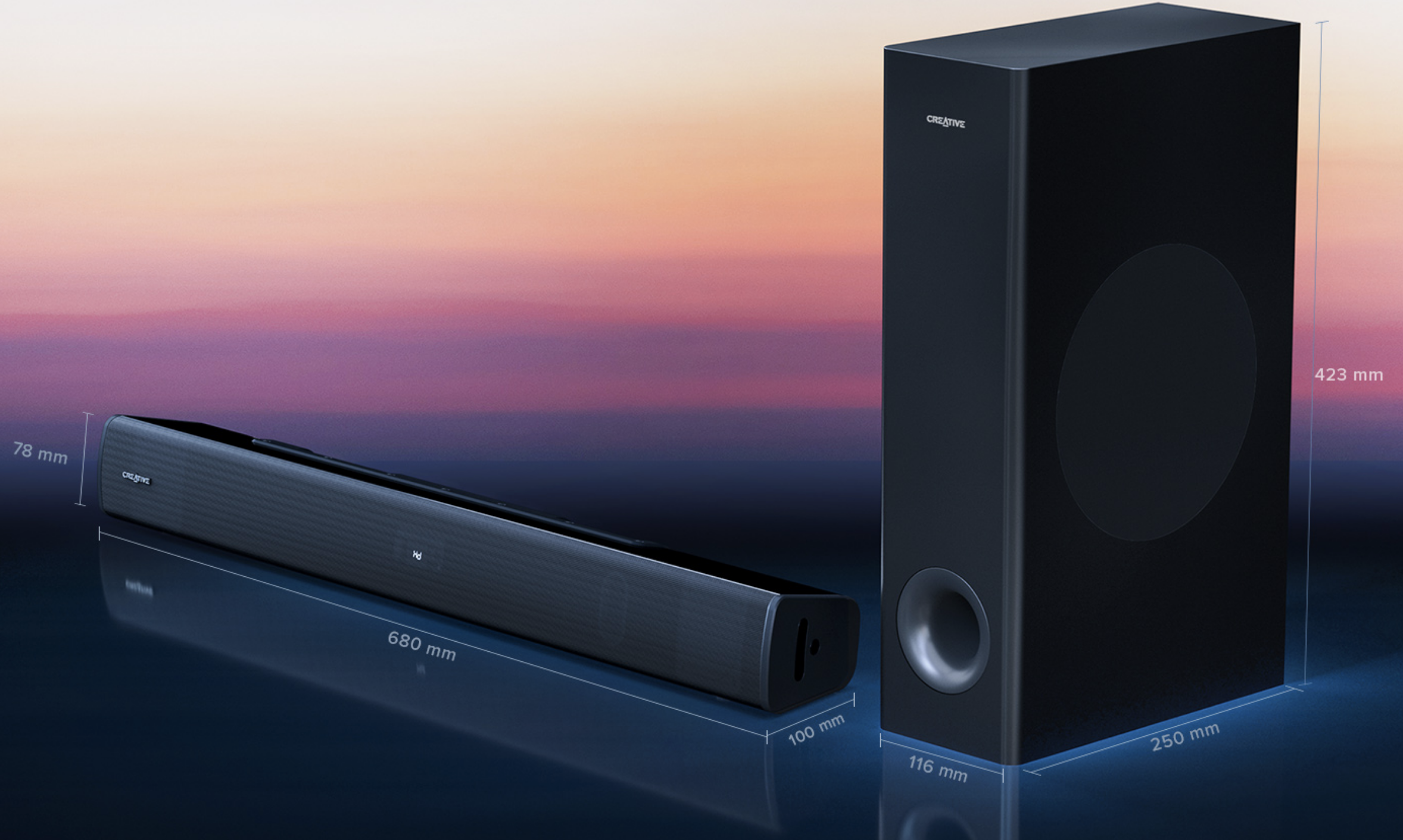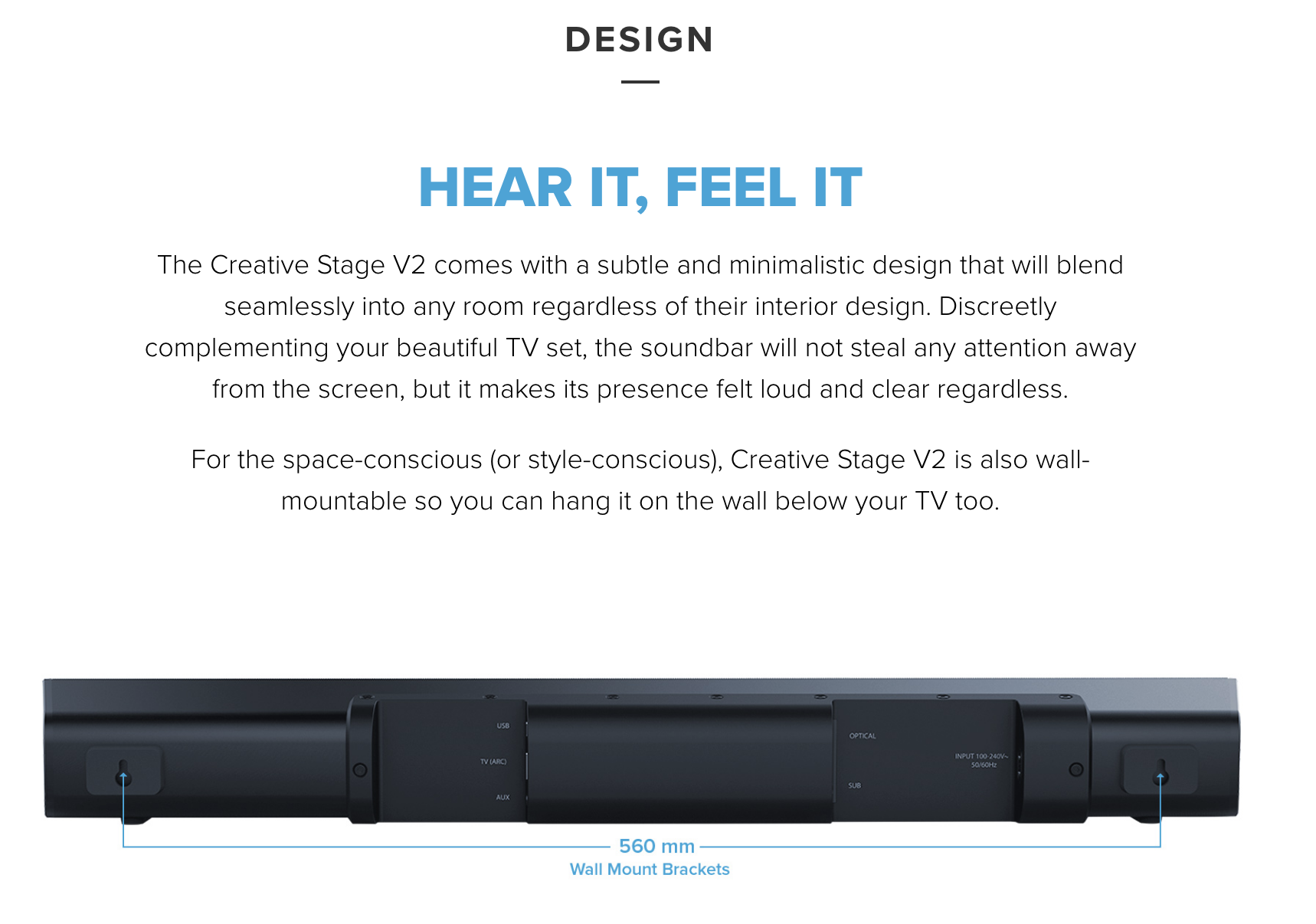 OVERVIEW The latest addition to our soundbar family, Creative Stage V2 now takes the stage as our latest all-in-one audio solution for your home. Debuting with Clear Dialog and Surround, audio features powered by our renowned Sound Blaster audio expertise, Creative Stage V2 is an easy upgrade for you to enjoy cinema experience at the comfort of your own home. Fill your living room with expansive rich audio and deep impactful bass with the soundbar and its dedicated subwoofer. With a wide range of connectivity options, the Creative Stage V2 is a one-stop audio entertainment system for all your devices. ![]() ![]() YOUR TV DESERVES TO SOUND BETTER Sure, your 4K TV looks magnificent, but they seldom have the sound to match. Upgrade your TV experience with the sound it deserves by adorning it with the Creative Stage V2. Immerse yourself in movies or games while Creative Stage V2 brings you exceptional sound quality with its custom-tuned mid-range drivers and deep thumping bass from the accompanying powerful long-throw subwoofer. ![]() ![]() SURROUND CLEAR DIALOG Complete your immersive movie experience with our Surround technology, powered by Sound Blaster to deliver a wider soundstage to your media! It is capable of identifying and enhancing the spatial information of incoming audio via Sound Blaster's audio filters, thereby optimizing the listening experience for both two-channel and multi-channel source content. The result is expanded soundstage and spatialized audio from any type of audio source, including Netflix, HBO, and Amazon Prime Video, providing you with a more realistic and comfortable listening experience akin to cinemas. It's great when your movie or game comes with rich and immersive audio, but it's a total downer if the dialog gets drowned out amongst the explosive sound effects and music. Clear Dialog extracts the vocals and spoken dialog through an algorithm, then intelligently enhances and amplifies them, allowing you to hear each syllable clearly, and without compromising on the other ambient effects. ![]() ![]() ![]() ![]() ![]() CONNECTIVITY  |