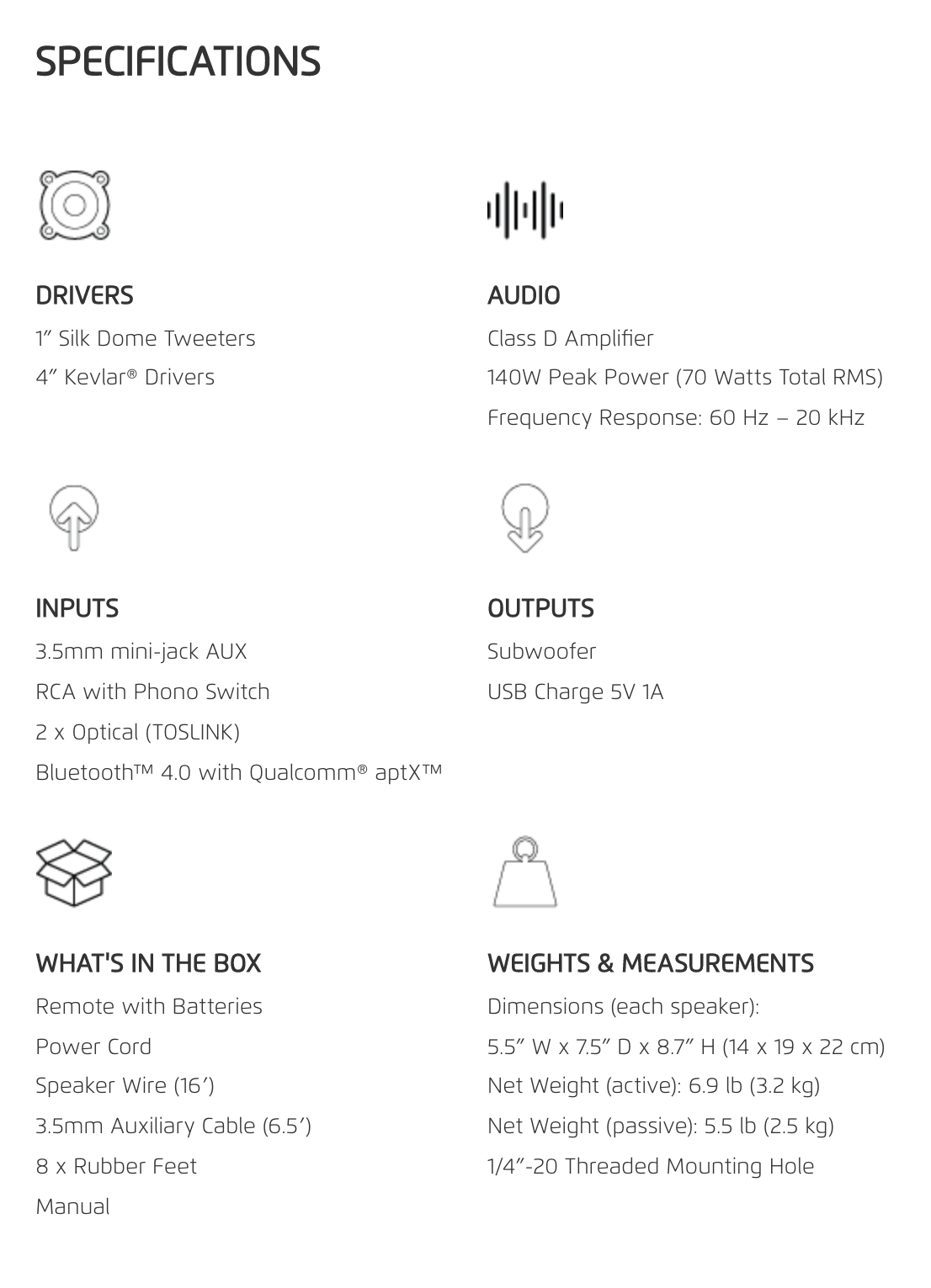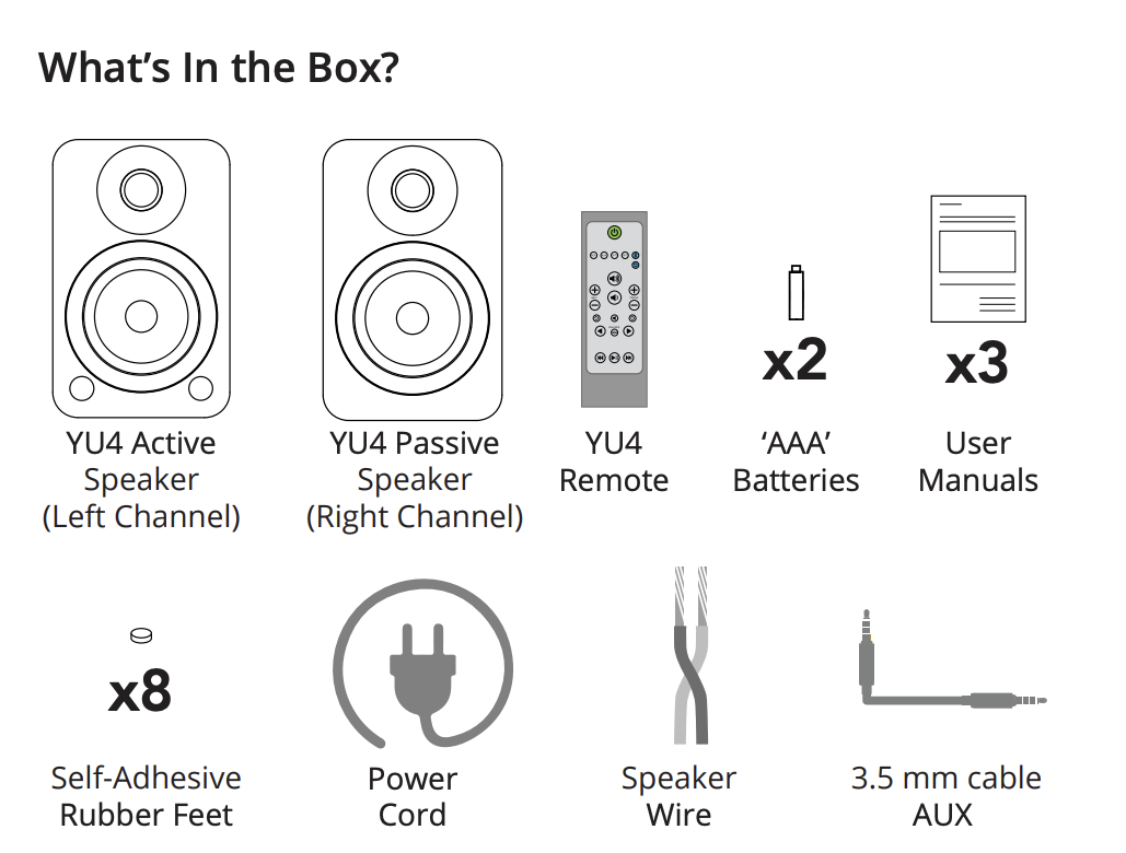 ![]() YU4 POWERED SPEAKERS ![]() ![]() Effortlessly fill your room with rich, spacious sound. Featuring carefully designed 4-inch Kevlar® drivers and 1-inch silk dome tweeters, YU4 faithfully reproduces your favorite tunes, letting you enjoy them to their fullest. Throw on your latest vinyl with a built-in phono preamp, or sit back and stream your carefully curated playlist via Bluetooth™ 4.0 with Qualcomm aptX. Crystal-clear, detailed sound for all to enjoy. High-performance materials. Exceptional sound. ![]() SILK DOME TWEETERS YU4’s 1-inch tweeters are made from silk to deliver a high-frequency range that is bright and refined. Their dome shape improves sound dispersion to ensure your ears capture every sound, regardless of where you are in the room. ![]() KEVLAR® DRIVERS Well-known for its strength and rigidity, Kevlar® ensures accurate sound reproduction even at higher volumes. Crank your favorite tunes without sacrificing performance. ![]() VINYL Throw on your favorite record. YU4 comes equipped with a built-in phono preamp, allowing you to easily connect any vintage or modern-day turntable. Toggle between line-level and phono with a simple flip of a switch, and reduce noise using the provided ground terminal. ![]() STREAMING Play tunes from the palm of your hand. Featuring integrated Bluetooth 4.0 with Qualcomm® aptX™ technology, YU4 lets you stream high-quality audio directly from any Bluetooth-enabled device. Sit back and enjoy your carefully curated playlist from anywhere in the room. ![]() ![]() ![]() ![]() ![]() NEARFIELD Take control of your sound. Packed with functionality, the YU series remote makes listening to audio more convenient. Quickly switch between sources, tune your sound to fit your space, and control playback while streaming via Bluetooth. Upgrade your desktop setup. Take your desktop setup to the next level by connecting YU4 to your computer via the RCA, AUX or Optical TOSLINK inputs. To reduce vibration and improve soundstaging, use YU4 with S4 desktop speaker stands. |