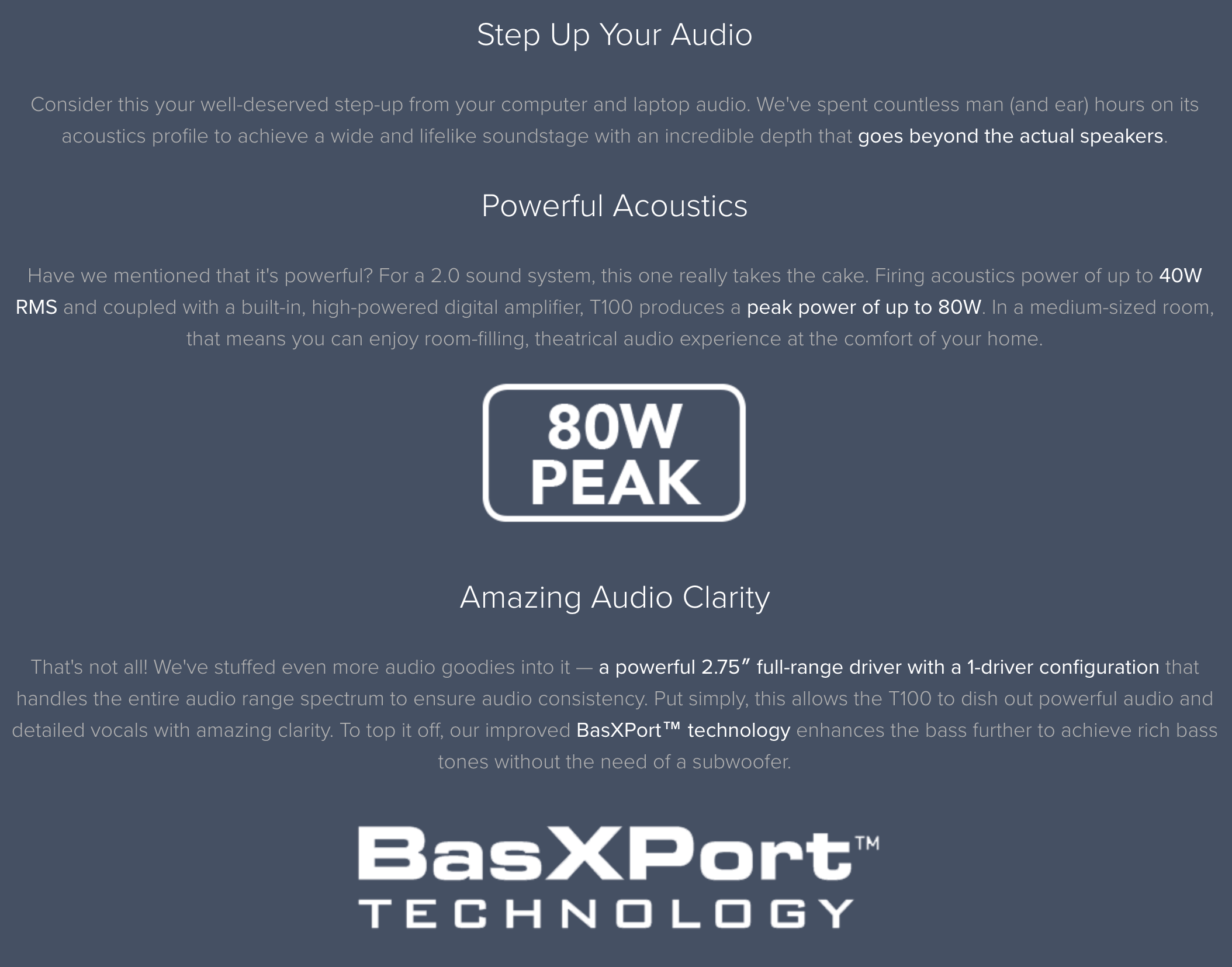 ◼️ CREATIVE T100 มาพร้อมกับดอกลำโพงแบบ full-range ขนาด 2.75 นิ้ว จำนวนสองตัว ที่มาพร้อมกับดิจิตอลแอมปริฟลายเออร์ สามารถรองรับทุกย่านเสียง และขับเสียงออกมาได้อย่างมีพลัง ด้วยกำลังขับขนาด 40W RMS หรือพีคสูงสุดที่ 60W
