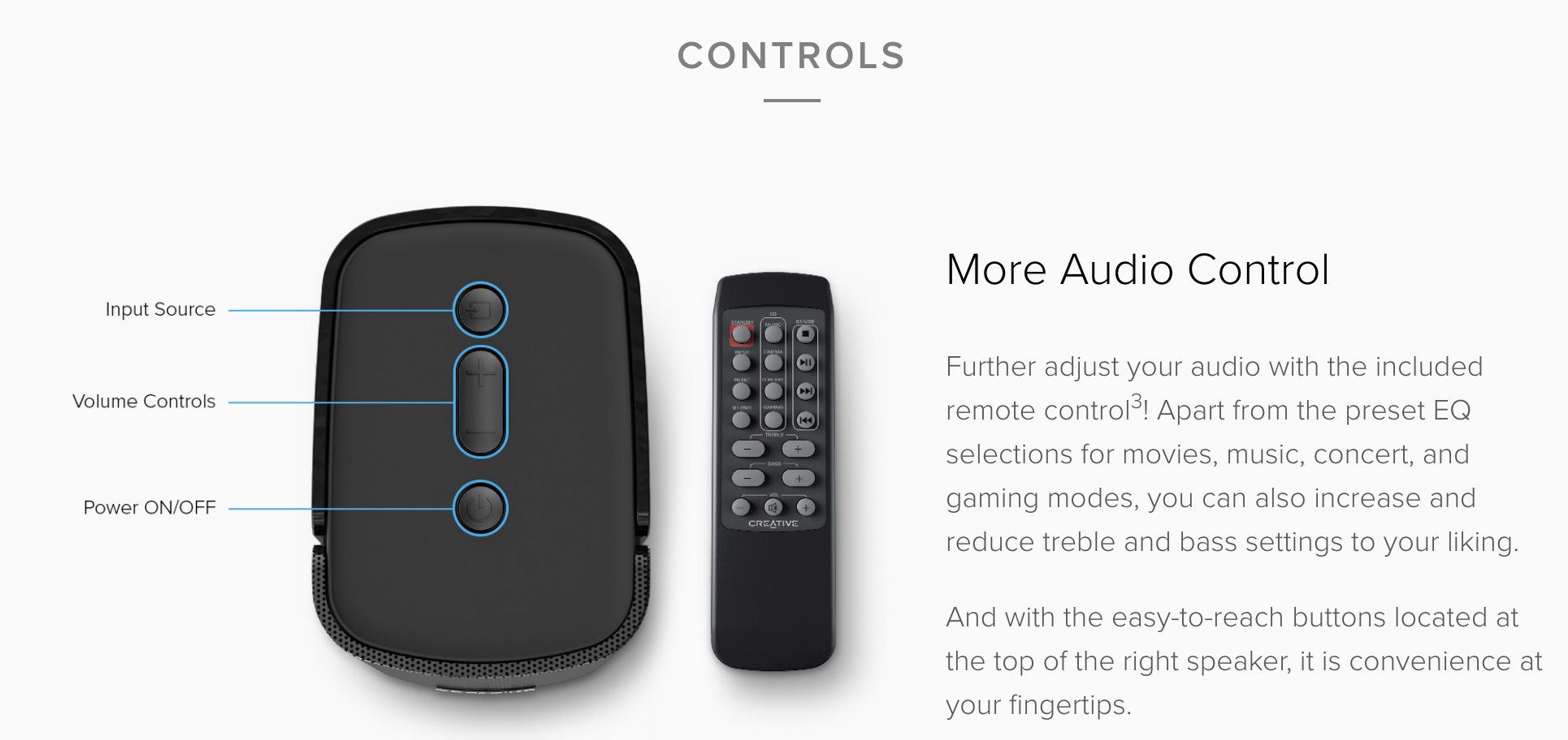 ◼️ บนตัวลำโพง T100 มีปุ่มควบคุมระดับเสียง การเลือกแหล่งเสีย และเปิด/ปิดลำโพง แต่เมื่อคุณต้องการการปรับแต่งที่มากขึ้น T100 มาพร้อมกับรีโมทควบคุมที่จะเพิ่มตัวเลือกในการปรับแต่งที่มากยิ่งขึ้นกว่าเดิม อาทิ การเลือก EQ สำหรับ เพลง หนัง หรือ เกม คุณสามารถเลือกปรับระดับเสียง แหลม หรือเสียงเบสได้อีกด้วย