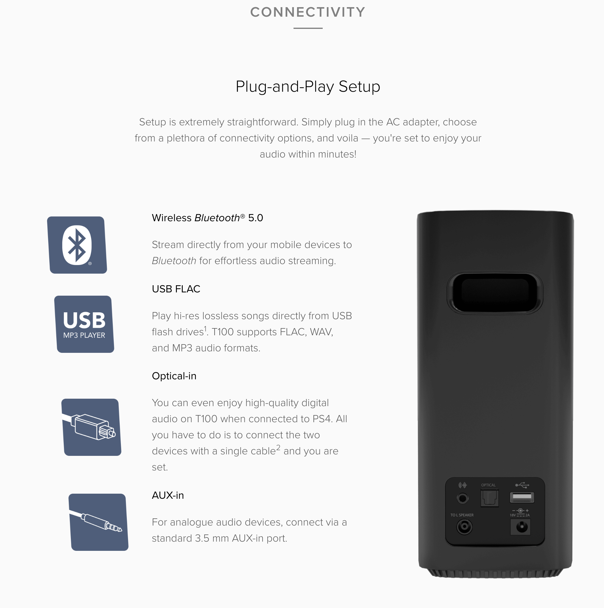 - Plug & Play เพียงแค่เชื่อมต่อลำโพง T100 ผ่าน สาย aux-in 3.5 มม. เข้ากับเครื่องเล่น ก็พร้อมใช้งานได้ทันที