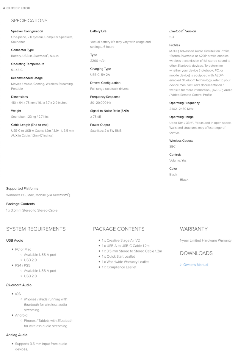 Designed for versatile use, the Creative Stage Air V2 comes with both wired and wireless playback capabilities, so setting up is a breeze.