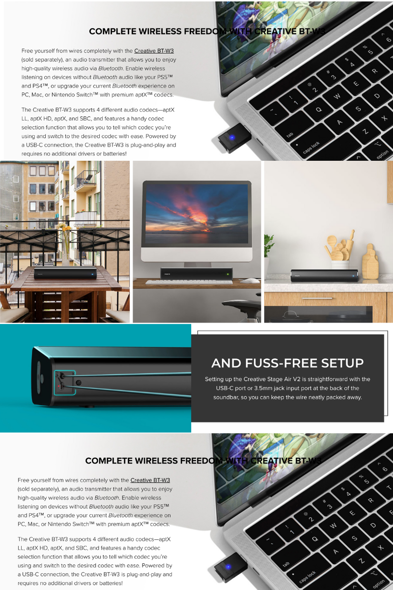 Free yourself from wires completely with the Creative BT-W3 (sold separately), an audio transmitter that allows you to enjoy high-quality wireless audio via Bluetooth. Enable wireless listening on devices without Bluetooth audio like your PS5™ and PS4™, or upgrade your current Bluetooth experience on PC, Mac, or Nintendo Switch™ with premium aptX™ codecs.